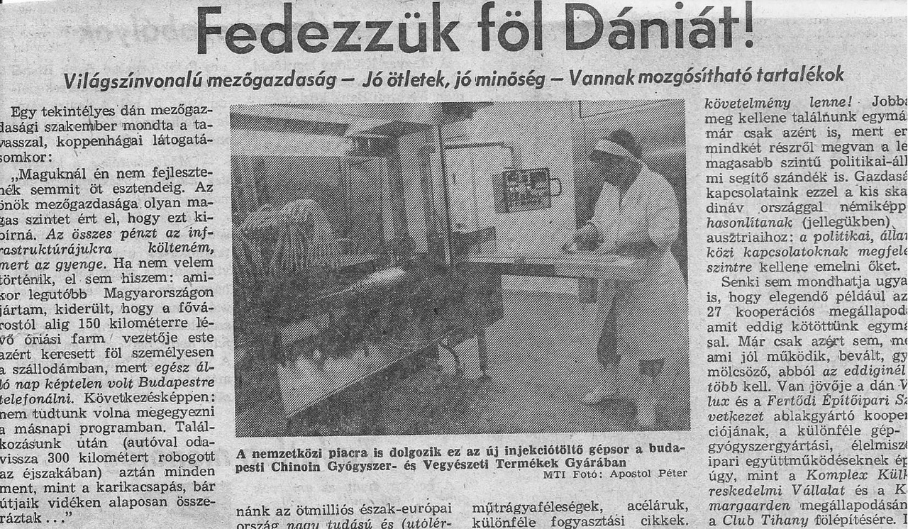 „Bejáratott” piacaink – NSZK, Ausztria, Hollandia, Svédország és mások – mellett úgy véljük, az eddiginél nagyobb figyelmet kellene fordítani Dániára. Külkereskedőknek, vállalati szakembereknek egyaránt. Érdemes lenne például megtalálni az utat a világhírű Bruel/Kjaer műszergyártó céggel való kooperációhoz. Minden bizonnyal lenne hozzá szellemi kapacitásunk gyártási gyakorlatunk, tapasztalatunk, sőt anyagunk is. Szűz területnek tetszik a dán hajóépítő ipar is, melynek megrendeléseiért netán magyar cégek is versenybe szállhatnának.