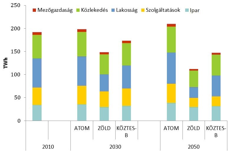 Az alábbi diagram szemlélteti, hogy a zöld és a köztes-B forgatókönyv megvalósulása révén jelentősen tudna csökkenni az ország energiafelhasználása, elsősorban a lakóépületekben elérhető megtakarítások révén. A hivatalos, atom szcenárióban viszont az energiafogyasztás a jelenlegihez képest emelkedne.