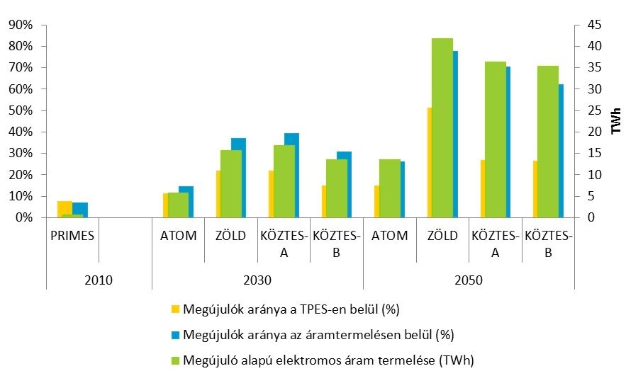 A megújulók 2050-ben az áramtermelés 62%-át biztosítanák a KÖZTES-A, 83%-át a ZÖLD szcenárióban. A teljes primerenergia-ellátásban 26, illetve 51%-ot tennének ki a megújuló energiaforrások. Az ATOM szcenárióban a megújuló energiaforrások az elektromos áramtermelés mindössze 24%-át, a primerenergia ellátás mintegy 15%-át fedeznék 2050-re. Így a 2020–50 közötti időszakban csak elenyésző mértékben nőne a megújuló energiaforrásokból előállított energia aránya a 2020-ig kitűzött 14,65%-os (bruttó végső energia-felhasználásra vonatkozó) megújuló részarány elérése után.