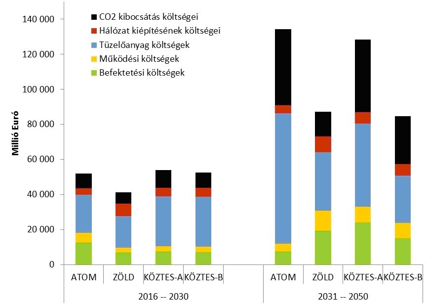 Így a villamosenergia-rendszer összes költsége – beleértve az erőművi beruházásokat, a hálózattal kapcsolatos fejlesztéseket, a szén-dioxid-kibocsátás költségét és a tüzelőanyag-költségeket is – az ATOM szcenárióban 2030-ig 52 milliárd euró, a ZÖLD szcenárióban pedig 41 milliárd eurót tesz ki, míg a 2030–50 közötti időszakban 130, illetve 87 milliárd euró becsülhető. Látható, hogy ha a két időszak költségeit összesítjük, akkor a mától 2050-ig terjedő időszakban az atom forgatókönyv teljes költsége több mint 180 milliárd, míg a zöld úté kevesebb, mint 130 milliárd euró.