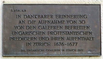 Az emléktábla szövege: Köszönetteljes emlékezettel a gályarabságból 1676–1677 között megszabadított harminc magyar protestáns igehirdető befogadásáért és zürichi tartózkodásukért. Zürich a 17–18. század fordulóján a Nápolyban kiszabadított gályarabok befogadásában betöltött szerepe által volt fontos a hazai protestáns értelmiség számára: 1676-ban harminc magyarországi evangélikus és kálvinista lelkész – kiszabadított gályarab, illetve börtönökből megváltott menekült – érkezett Zürichbe. A svájci város jelentős szerepet vállalt a gályarabok megsegítésében, ugyanis a protestáns kantonok pénzgyűjtő akciójában irányító szerepet játszott, majd ezt követően befogadta az összes üldözöttet és biztosította ellátásukat is. Ráadásul Zürichben nem csak a gályáról, hanem néhány börtönből szabadult protestáns lelkész is menedéket talált. A menekültek fele mintegy másfél évig maradt itt, míg a többiek Európa protestáns államaiba látogattak.