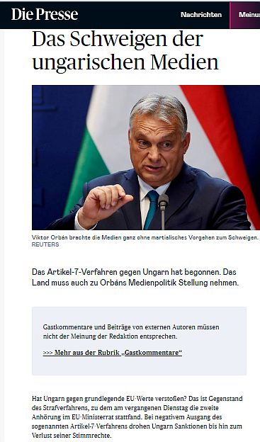 „A magyar média hallgatása” címmel az osztrák Die Presseben arra figyelmeztet a bécsi székhelyű Nemzetközi Sajtóintézet helyettes vezetője, hogy a most zajló jogállami eljárásban az orbáni sajtópolitikáról is véleményt kell mondani. Scott Griffin, aki nemrégiben tényfeltáró küldöttség tagjaként Budapesten járt, emlékeztet arra, hogy meglehetősen hosszú a magyar kormány elleni vádak listája, de egészen elől szerepel rajta, hogy a rezsim felszámolja a független újságírást. A már említett delegáció arra jutott, hogy Magyarországon 2010 óta módszeresen visszaszorítják a média szabadságát és sokszínűségét. Ily módon a hatalom az unión belül példátlan módon ellenőrizni tudja a tömegtájékoztatást. Ehhez Orbánnak még csak nem is volt szüksége drákói lépésekre. Egyetlen sajtómunkást sem vettek őrizetbe, senkinek nem kellett fizikai erőszaktól tartania.