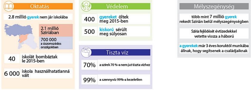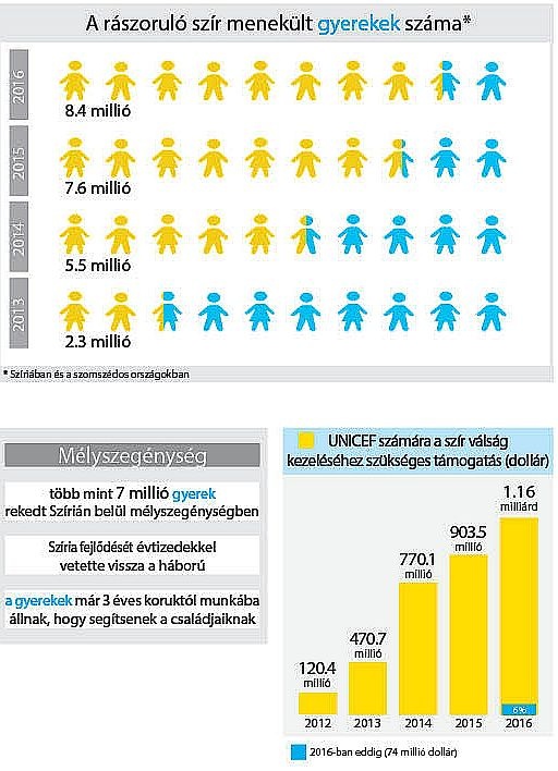 A Szíriában és menekültként a szomszédos országokban élő szír gyerekek támogatásához 2016-ban szükséges finanszírozás csupán 6 százalékát kapta meg eddig az UNICEF. Tavaly az UNICEF, valamint helyi és nemzetközi partnerek nagy hálózata rászoruló gyerekek millióinak tudott segélyt szállítani Szíriában és a szomszédos országokban.