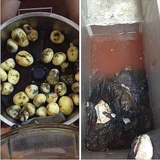 Ezt a krumplit adták a gyerekeknek (bal oldali kép), a jobb oldali képen látható fekete szemetes zsákokban van a hús, aminek a leve látható a tároló alján. 50 millió dolláros bevétel mellett, ezeket kapták a gyerekek. A fotók a volt nevelő felvételei.