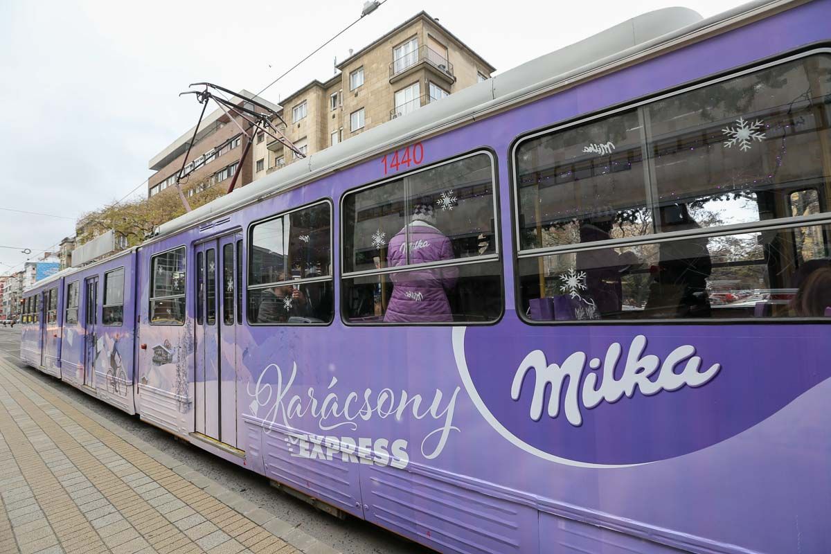 A Milka karácsony-express kampányának egyik látványos népszerűsítője a csokoládémárka lilájába öltöztetett budapesti villamos.