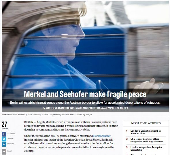 A lap azonban kérdésesnek tartja, hogy ezzel a megállapodással – még ha sikerülne is megszerezni a többi érintett beleegyezését – tartósan képes lesz-e együttműködni egymással Angela Merkel és Horst Seehofer. Októberben tartományi választásokat tartanak Bajorországban. A Politico utal azokra a közvélemény-kutatási adatokra, amelyek szerint a tartományt szinte emberemlékezet óta kormányzó uniópártot, a CSU-t akkor is büntetnék a szavazók, ha túlságosan engedékenynek tartanák a menedékkérőkkel kapcsolatban – és ebben az esetben a szélsőjobboldali Alternatíva Németországért pártot jutalmaznák a választáson; más szavazók akkor is büntetnék a CSU-t, ha a pártnak felróhatóan összeomlanék az uniópártok szövetsége.