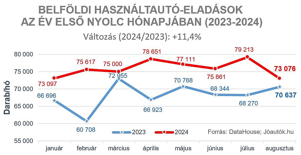 Miközben a használtautó-piacon 2024. augusztus végéig gazdát cserélt 607 600 személyautó 11,4 százalékkal több az előző év hasonló időszakában regisztrált 545 300-nál, az importált használt autók száma ugyanebben a periódusban 72 300 volt, ami mindössze 1,8 százalékkal múlja felül az egy évvel azelőtti 71 ezret.