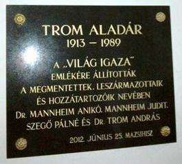 A bensőséges ünnepélyen Trom Aladárra, az életmentőre emlékeztek. Fia, Trom András, beszédében rámutatott: nem csupán édesapjára gondolt, amikor az emléktáblát kezdeményezte, hanem tisztelgésnek szánta a Trom Aladáréhoz hasonló tetteket végrehajtó, mintegy 750 honfitársunk előtt is. Ők a vészkorszak idején életük kockáztatásával és ellenszolgáltatás nélkül zsidókat mentettek.
