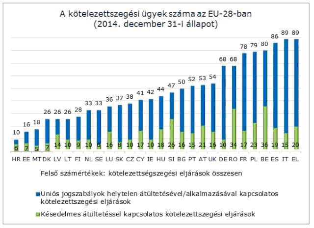 Az alábbi ábra áttekintést nyújt az egyes tagállamoknak az uniós jog késedelmes átültetésével, nem megfelelő átültetésével és/vagy helytelen alkalmazásával kapcsolatos helyzetéről.