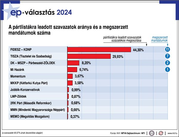 EP-választás, 2024: a pártlistákra leadott szavazatok aránya, megszerzett mandátumok