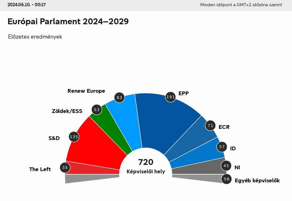 Az előzetes adatok szerint az egész EU-ban a részvételi arányt 51 százalékra becsülik. Az előrejelzések a leköszönő Parlament struktúráját és képviselőcsoportjait követik, és nem feltétlenül határozzák meg a következő Parlament összetételét, amely az alakuló ülésén válik véglegessé.