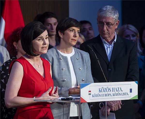 Kunhalmi Ágnes, az MSZP társelnöke (bal oldalt) beszédet mond a DK-MSZP-Párbeszéd pártszövetség európai parlamenti és önkormányzati választási eredményváró rendezvényén a budapesti Radisson Blu Béke Hotelben. Mellette Dobrev Klára, a DK-MSZP-Párbeszéd EP-listavezetője és Gyurcsány Ferenc, a DK elnöke. Foto: MTI/Szigetváry Zsolt