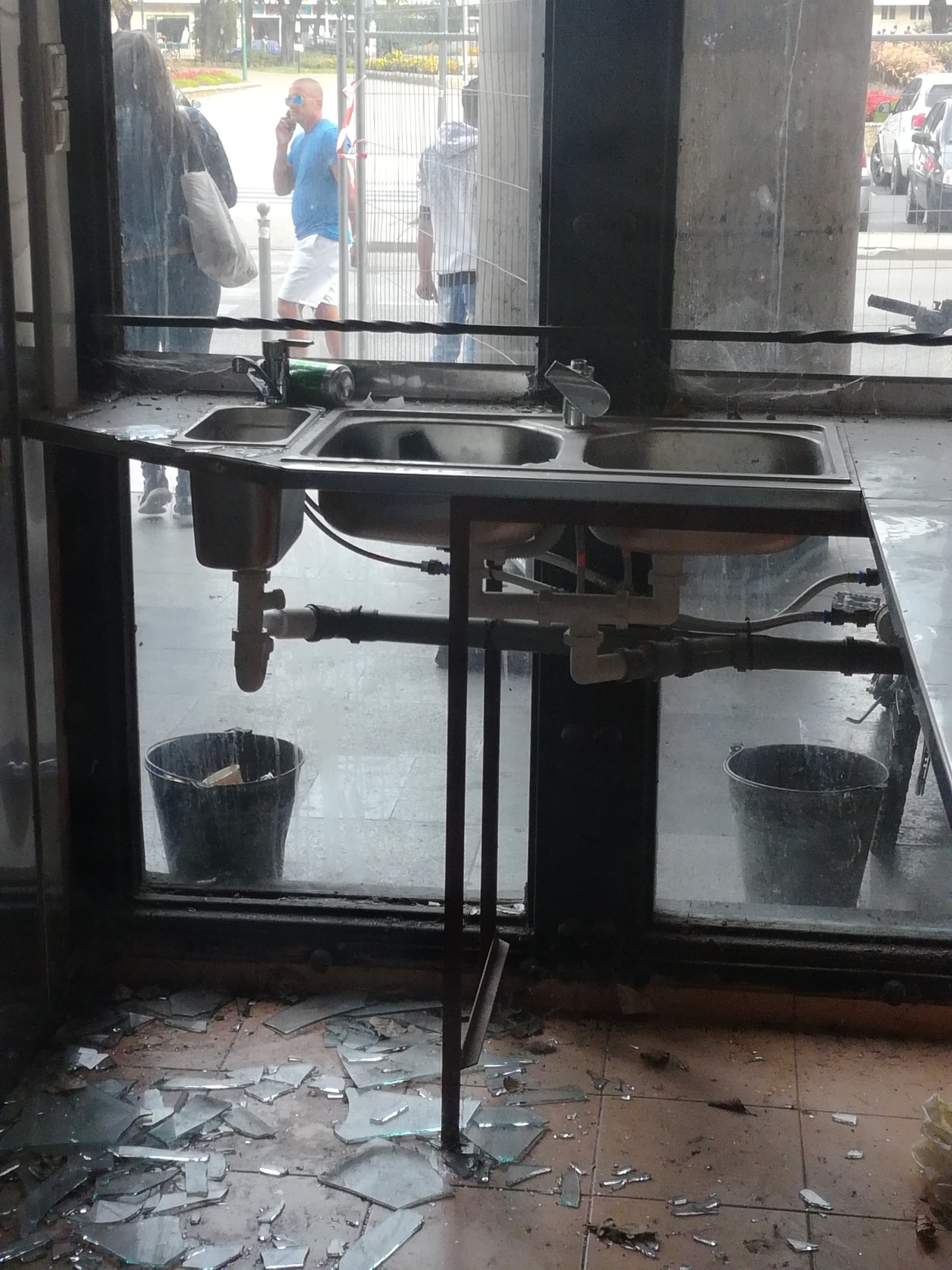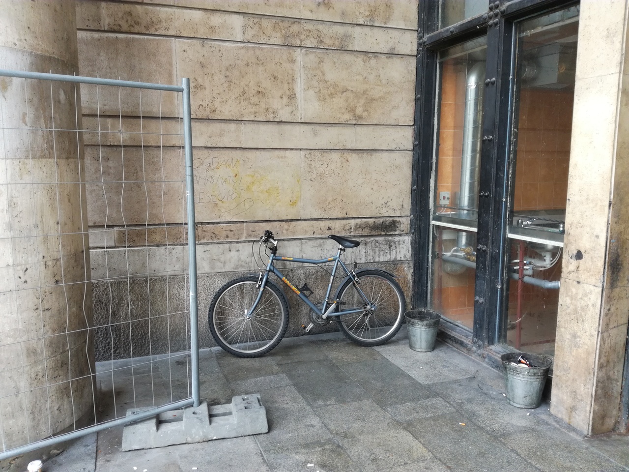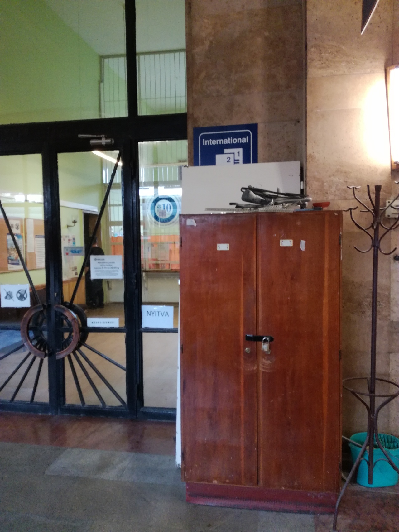 A rámpa végénél koszos sarok fogadja az állomásra belépőt. Egykoron a takarítást szolgált vödörből ürítetlen szemetes lett. Ugyanott – a ki tudja, hány évvel ezelőtt tisztított üvegajtó mögött – ez a kép fogadja a vonatjához igyekvőt: