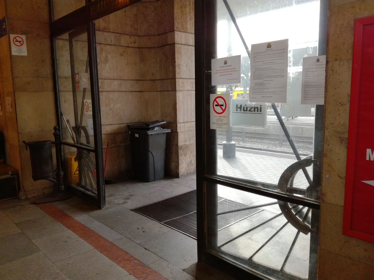 Az első vágányhoz vezető üvegajtó sem látott tisztítószert meg vizet az utóbbi hetekben-hónapokban, miként az aluljáró lépcsősorát és az indulási csarnokot megvilágítani hivatott üvegfal sem. A számtalan, provizórikusan kihúzott kábel sem sok hozzáértést bizonyít, miként ugyanebben a légtérben – érthetetlen módon és logika szerint – elhelyezett iratszekrény és kólaautomata.