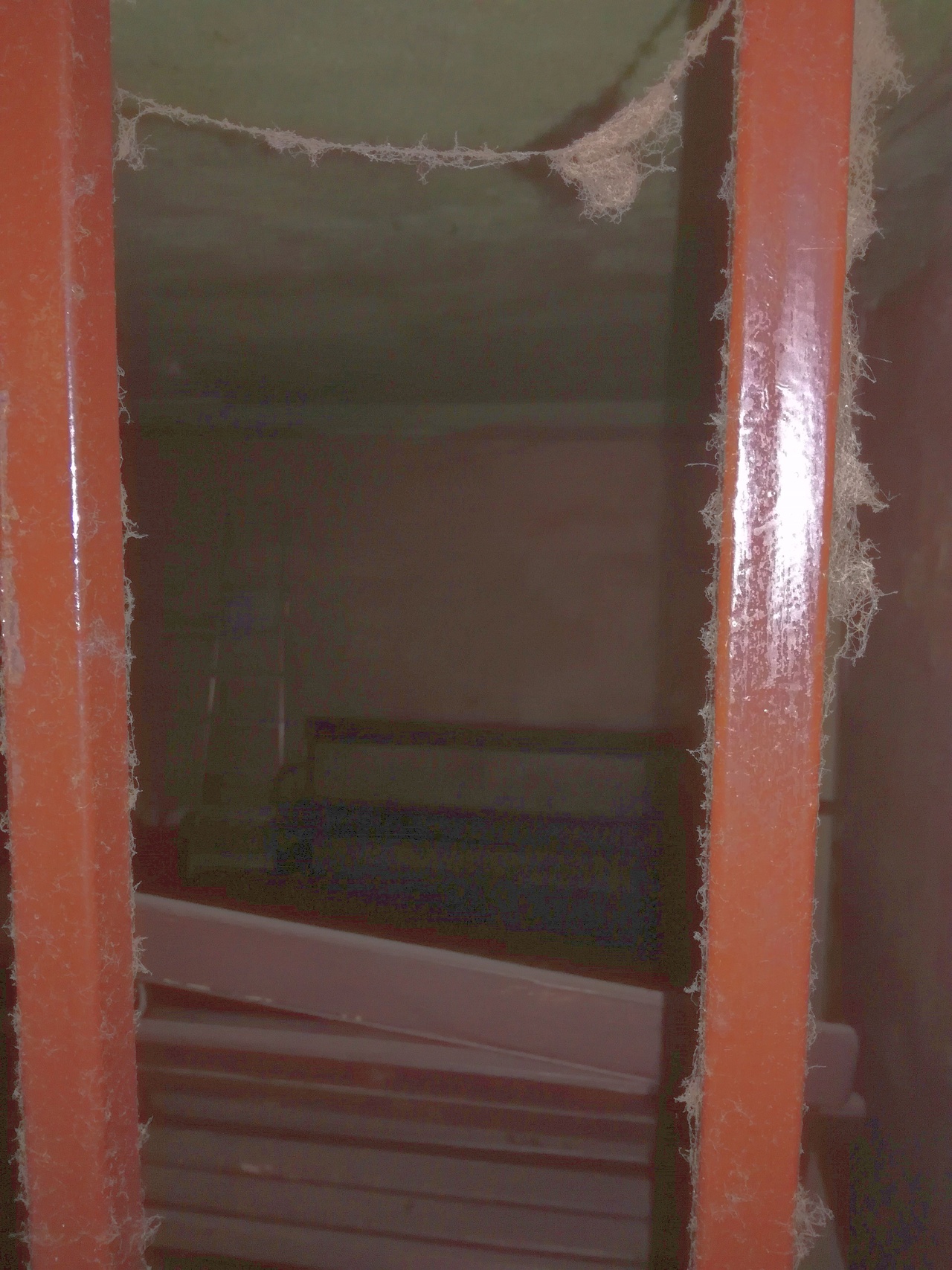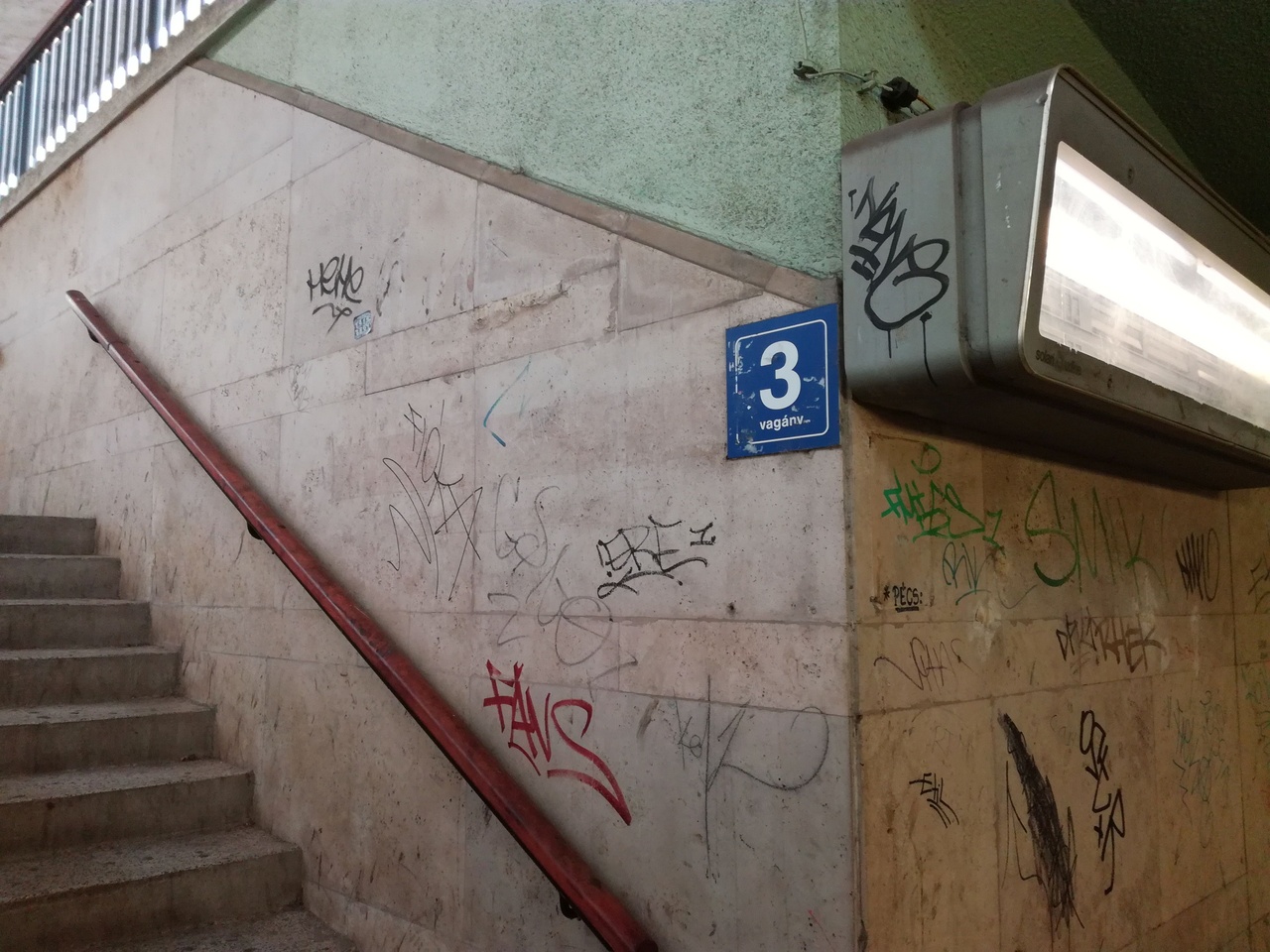 Jó lenne tudni, mire használják az indulási oldali aluljáró lépcsőjénél ezt a lyukat? Vele szemben látható, hogy egykor lépcsősor vezetett az aluljáróba az 1. peronról. Ma mindkettő a pókhálós enyészeté, akár elhagyott várbörtöncella is lehetne…
