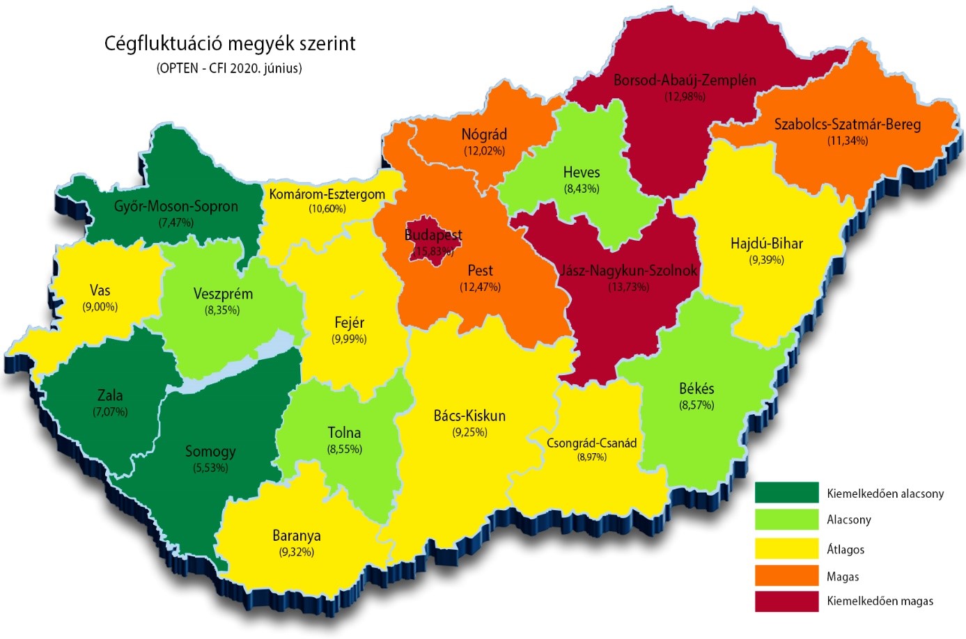 Az Opten Cégfluktuációs Index (az adott időszak alatt törölt és alapított cégek számát méri az időszak elején rendben működőkéhez) júniusi értéke átlagosan 9 százalék körül mozgott. Megyénként vizsgálva az Opten CFI Somogy, Zala és Győr-Moson-Sopron megyékben mérte a legjobb értékeket; a legmagasabb fluktuáció Budapesten, Borsod-Abaúj-Zemplén és Jász-Nagykun-Szolnok megyében ment végbe.