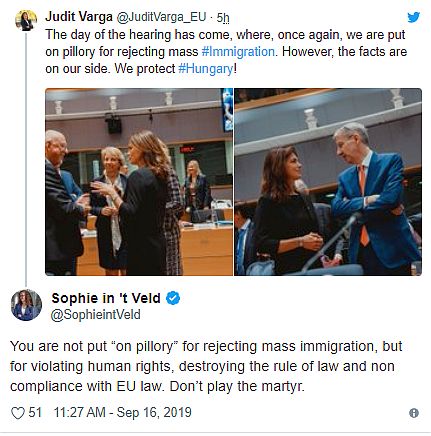 A holland liberális EP-képviselő, Sophie in ‘t Veld nem hagyta szó nélkül a bejegyzést, így válaszolt: