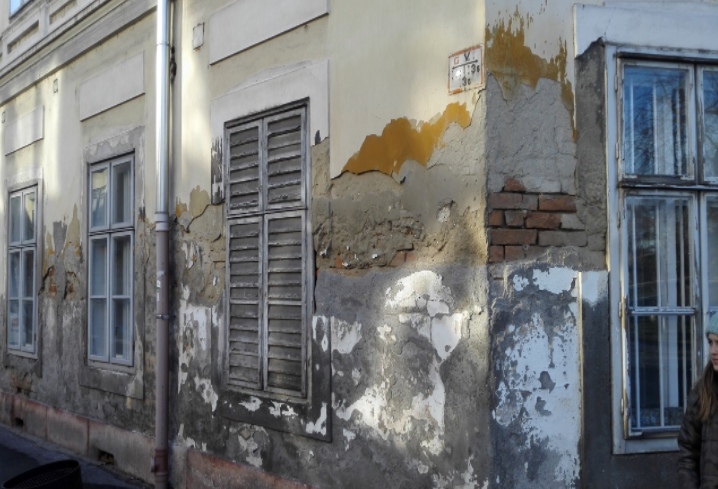 Ez alkalommal mégsem erről vagyunk írandók, hanem az eredeti témáról, a Rába-parti útvonal menti épületekről, különösen pedig a legrosszabb állapotúról, a Jókai utca 2. alatti sarokházról. Tessék csak megnézni cikkünk nyitó képét! Jó hat és fél évvel ezelőtt készült, a Google örökítette meg, és már akkor az ablakok tetejéig ért a vizesedés okozta penész, ami persze a vakolatot sem tűrte magán.